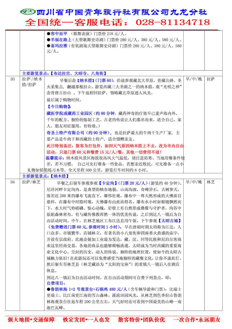 门 票 :所列景点门票【布宫100 大昭寺85 纳木措60 羊湖40 卡若拉冰川25 扎什伦布寺40 尼洋阁20 卡定沟15】如因政策改变请客人自理差价,如因政策性及天气原因无法参观景点,因散客为打包价,故只退门票,其他一切费用不退。因上布宫需要,请客人带好身份证!