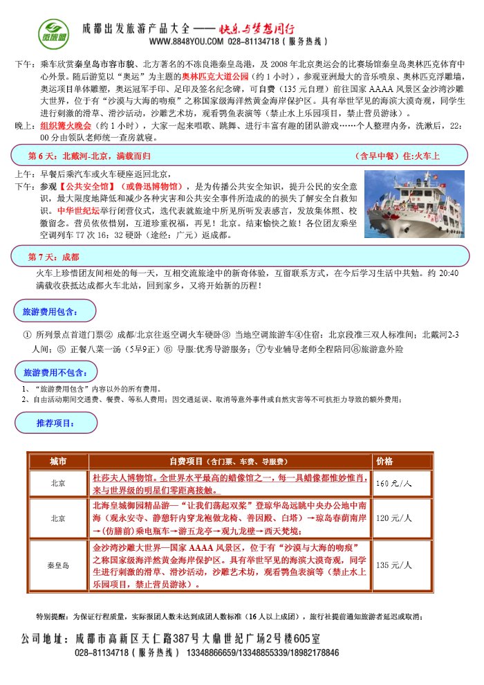 行程特色:清华/北大+颐和园+孔庙国学+中央电视塔+秦皇岛+南/北戴河+博物馆之旅。